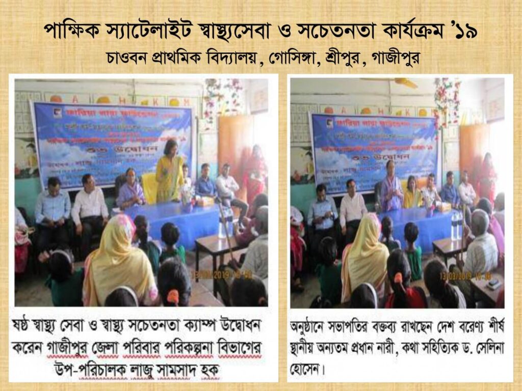 - কর্ম এলাকায় স্যাটেলাইট স্বাস্থ্য সচেতনতা ও স্বাস্থ্য সেবা কার্যক্রম : গণপ্রজাতন্ত্রী বাংলাদেশ সরকারের স্বাস্থ্য মন্ত্রণালয়ের আর্থিক সহায়তায় গাজীপুর জেলাধীন দুইটি উপজেলা গাজীপুর সদর এবং শ্রীপুর উপজেলায় বর্তমানে চলমান। রক্ষিতপাড়া, নয়াপাড়া, জানাকুর, ফাউগান, জয়নারায়নপুর ও চাওবন গ্রামে পাক্ষিক সূচি নির্ধারণ করে সপ্তাহের বুধবার ও বৃহস্পতিবার দুইজন বিশেষজ্ঞ চিকিৎসক, একজন স্বাস্থ্য প্রশিক্ষক, একজন প্যারামেডিক ও প্রশিক্ষণপ্রাপ্ত ফার্মাসিষ্ট দ্বারা স্যাটেলাইট স্বাস্থ্যসেবা কার্যক্রমের মাধ্যমে স্বাস্থ্য সচেতনতামূলক সেশন এবং বিদ্যালয়ের শিক্ষার্থী ও আগত রোগিদের পুষ্টিহীনতা জনিত দৃষ্টি শক্তি পরীক্ষাকরণ কার্যক্রম পরিচালিত হচ্ছে। প্রতিটি রোগীকে ব্যাবস্থাপত্র অনুযায়ী যথা সম্ভব বিনামূল্যে ওষুধ প্রদান করা হচ্ছে। যেটির মূল লক্ষ্য হচ্ছে দেশের মাতৃ ও শিশু মৃত্যুহার রোধ করে শূণ্যের কোটায় নিয়ে আসা। ২০১৮ সালের আগস্ট মাস থেকে ২০১৯ সালের অক্টোবর মাস পর্যন্ত ১৫৩টি স্যাটেলাইট ক্যাম্প পরিচালিত হয়। উক্ত ক্যাম্পের মাধ্যমে সর্বমোট ১৫,৭০১ জন রোগিকে স্বাস্থ্যসেবা প্রদান করা হয়েছে।